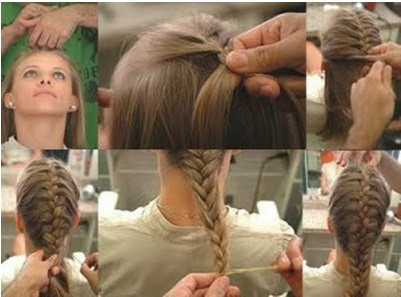 -Puxe as pequenas mexas sempre que for iniciar outra parte da trança, de preferência sempre trançando das laterais para o centro. Prenda a trança com um elástico de cabelo.